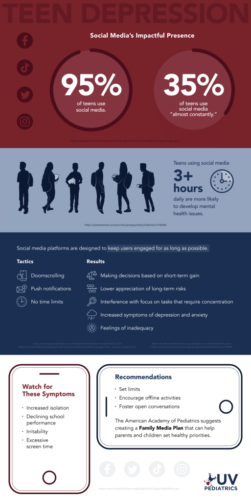To raise awareness about this growing issue, Utah Valley Pediatrics is shining a light on teen depression and its links to social media. This is the second of two articles offering insights into its impact and practical steps for parents. Today, we’ll look at the symptoms of teen depression, what parents can do to break the scroll cycle linking teen anxiety and social media, and broader community and institutional interventions.